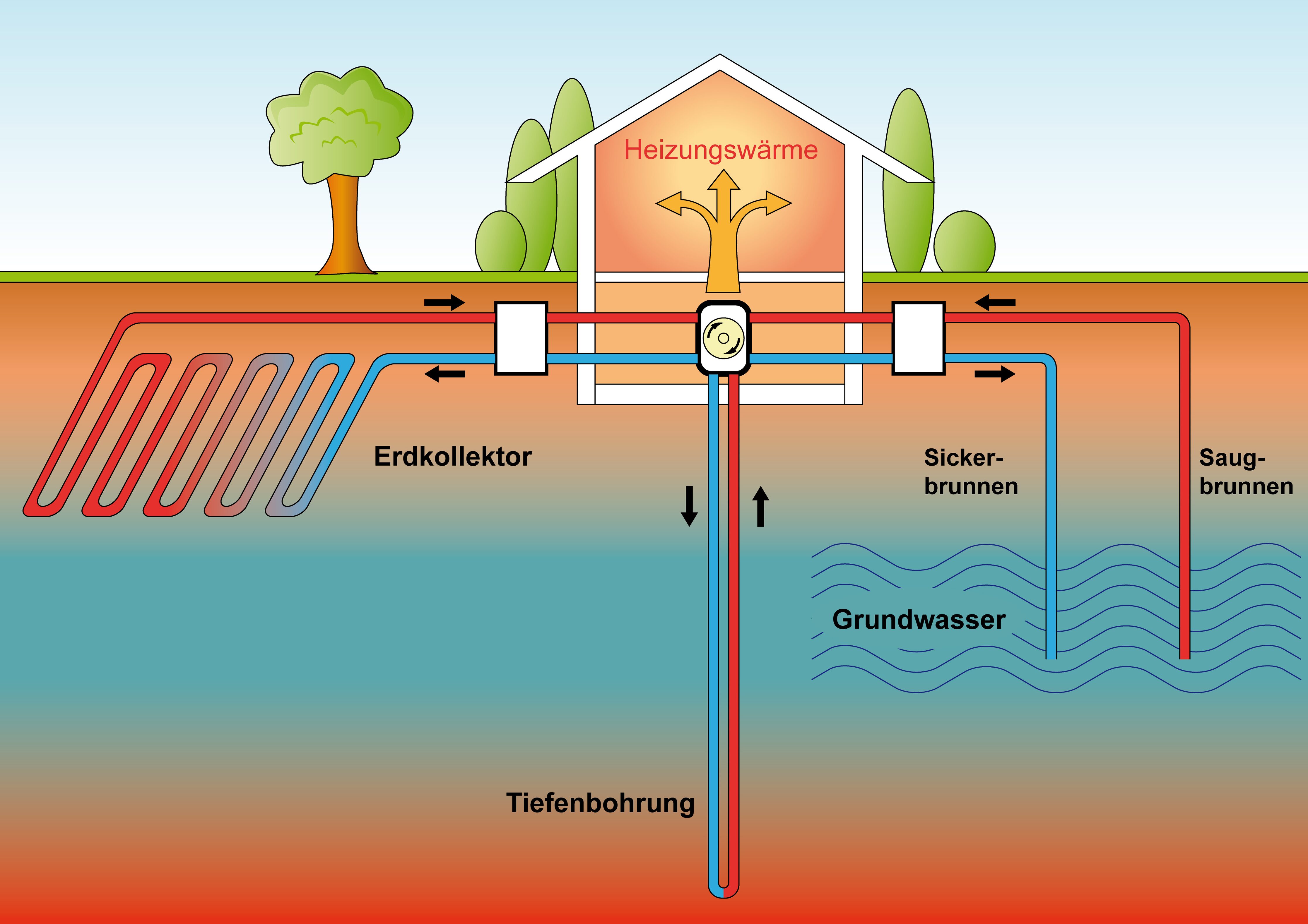 Eine Tiefenbohrung entzieht die Tiefenwärme aus 50m bis 120m. Es werden Kunststoffrohre in ein Bohrloch eingebracht und der Resthohlraum mit Betonit umfüllt. Damit wird eine gute Wärmeübertragung erreicht und gleichzeitig wird ein Austreten der Sole in das Grundwasser verhindert. Die Bohrung wird von einem mobilen Bohrunternehmen durchgeführt. Danach werden die Sondenvor- und Rückläufe durch frostsicher verlegte, horizontale Anschlussleitungen über einen Verteiler mit der Wärmepumpe verbunden und das System mit der Sole (Gemisch aus Wasser und Glykol) befüllt und entlüftet. Außer Verteilerschächten sind oberhalb der Erdoberfläche nach der Fertigstellung keine Installationen mehr sichtbar.